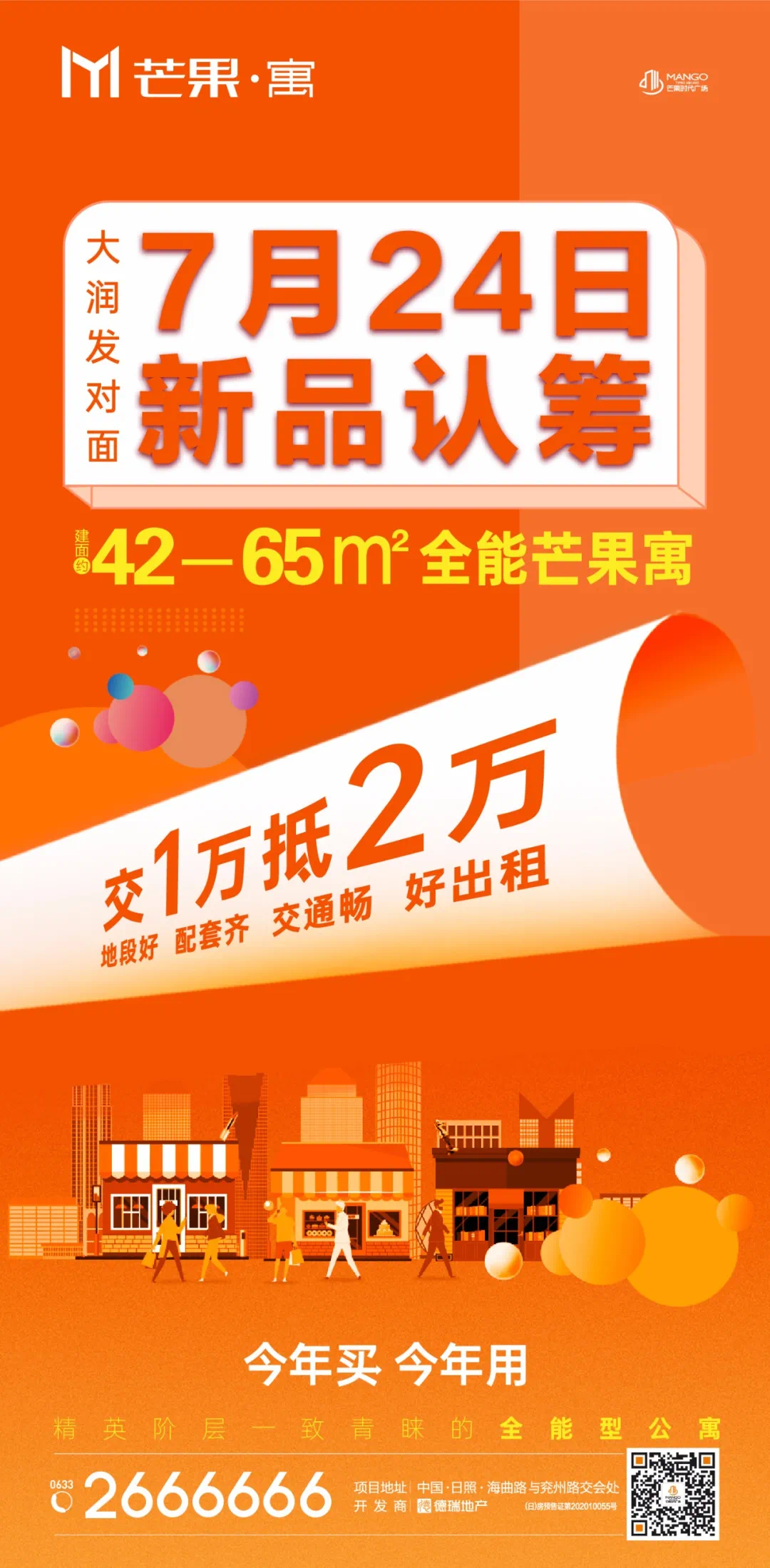 芒果寓建面约42-65㎡全能多变公寓,占据大润发商圈优渥区位,楼下即是15万平芒果时代广场综合体,潮流娱乐、衣食住行,面面俱到,纵享一城便利繁华。目前海底捞、家家悦、芒果国际影城已签约入驻,精彩一触即发!