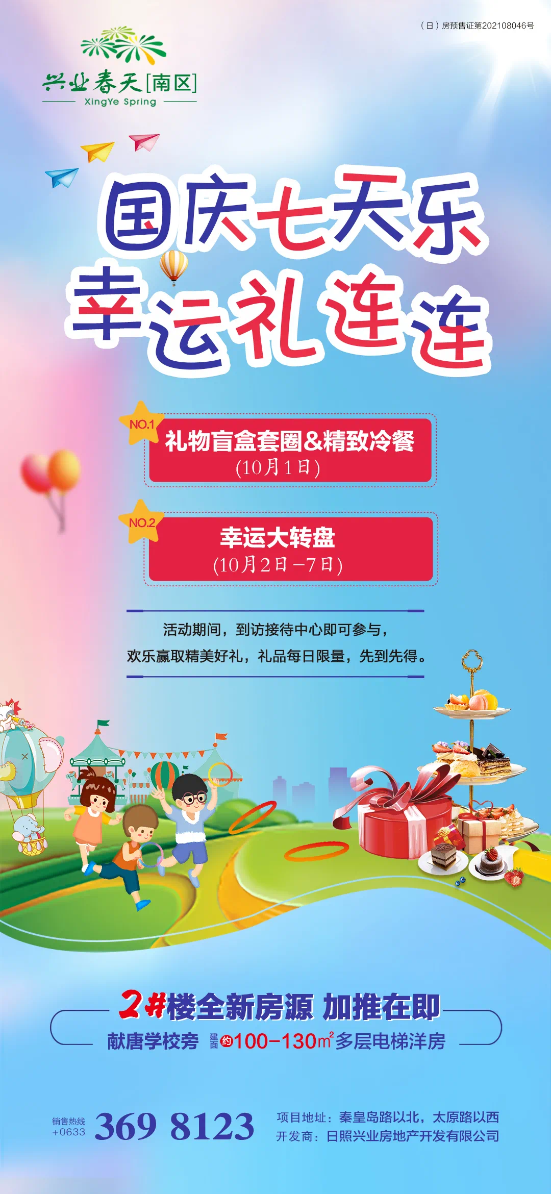 国庆期间,兴业春天南区接待中心将设置幸运大转盘,每组到访者可免费获得一次转奖机会,100%中奖,每天奖品数量有限,送完即止。