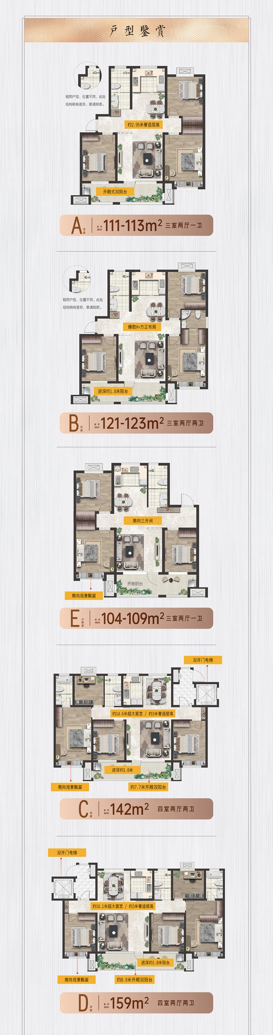 建面约104-159㎡舒居三室、朗阔四室